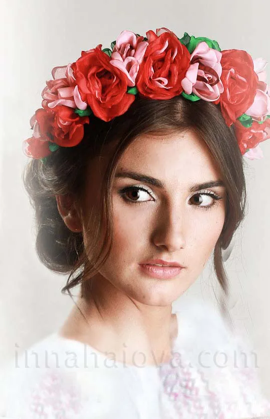 Вінок створений за мотивами українського народного вбрання і може використовуватися як доповнення до сучасного костюма в етнічному стилі.